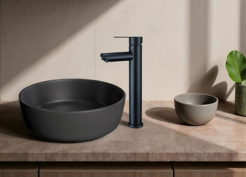 Defining modern sophistication, this design features a sculptural vessel sink in a deep matte black finish that creates a striking contrast against the warm, natural stone countertop. Paired with a sleek, high-rise faucet in a matching monochrome tone, this ensemble merges architectural elegance with everyday utility, establishing a serene and cohesive design statement perfect for a contemporary space.